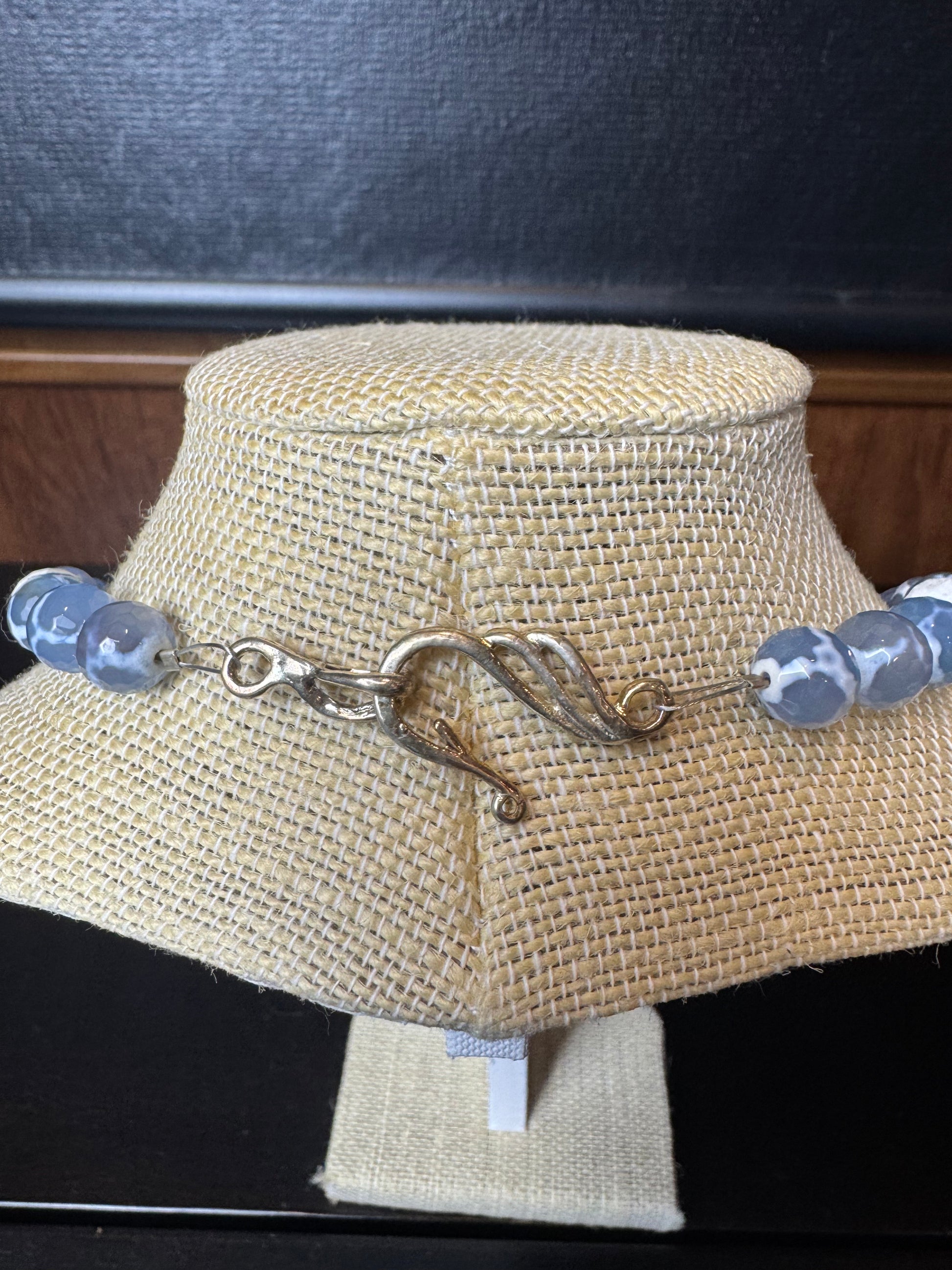 Elevate your style with this enchanting 22-inch necklace, featuring mesmerizing Blue and White Lace Agate beads, accented with opaque white beads and delicate silver star-shaped spacers. The soft blue and swirling white patterns in each Agate bead create a calming, cloud-like effect that feels both elegant and celestial.
