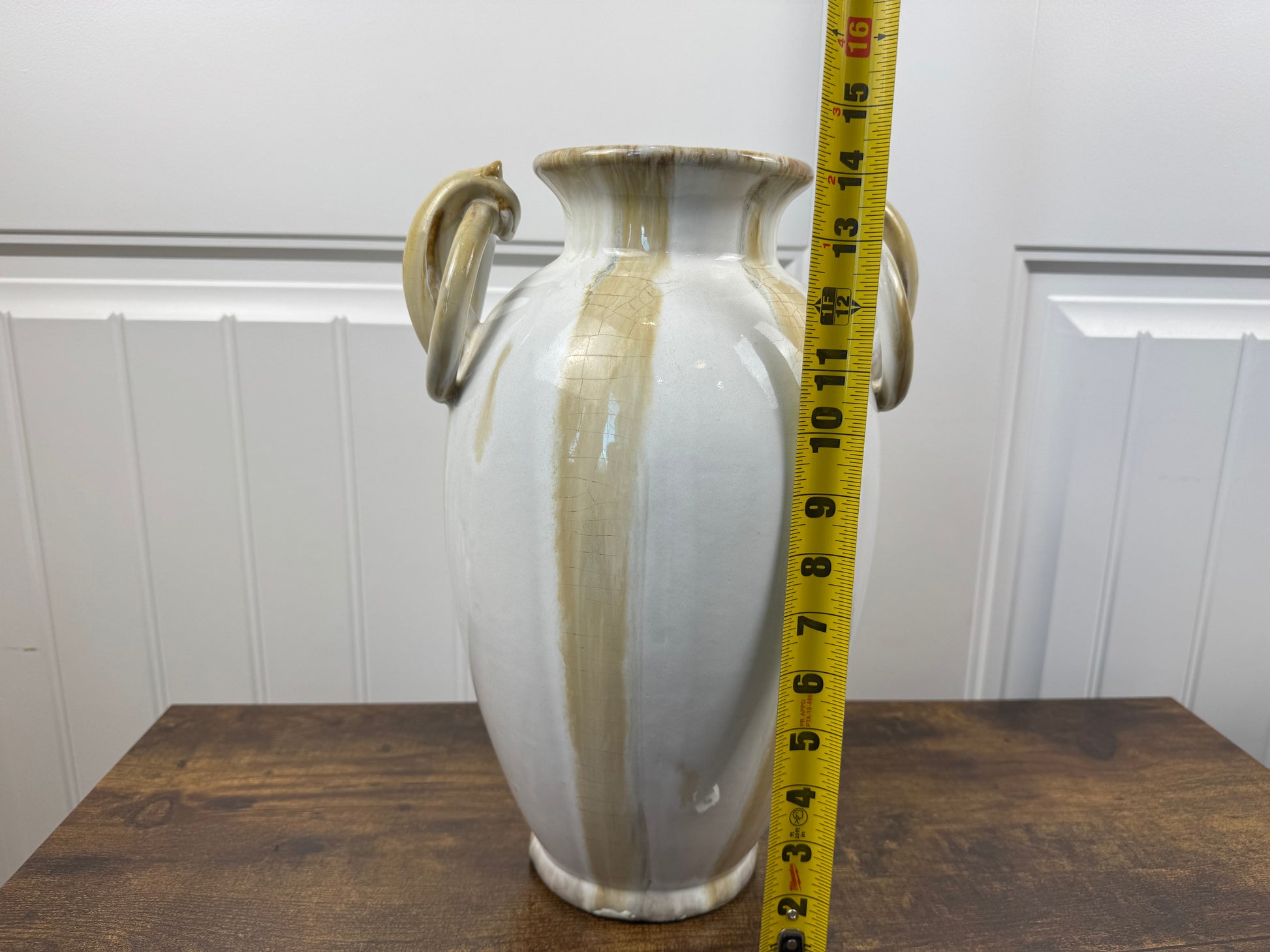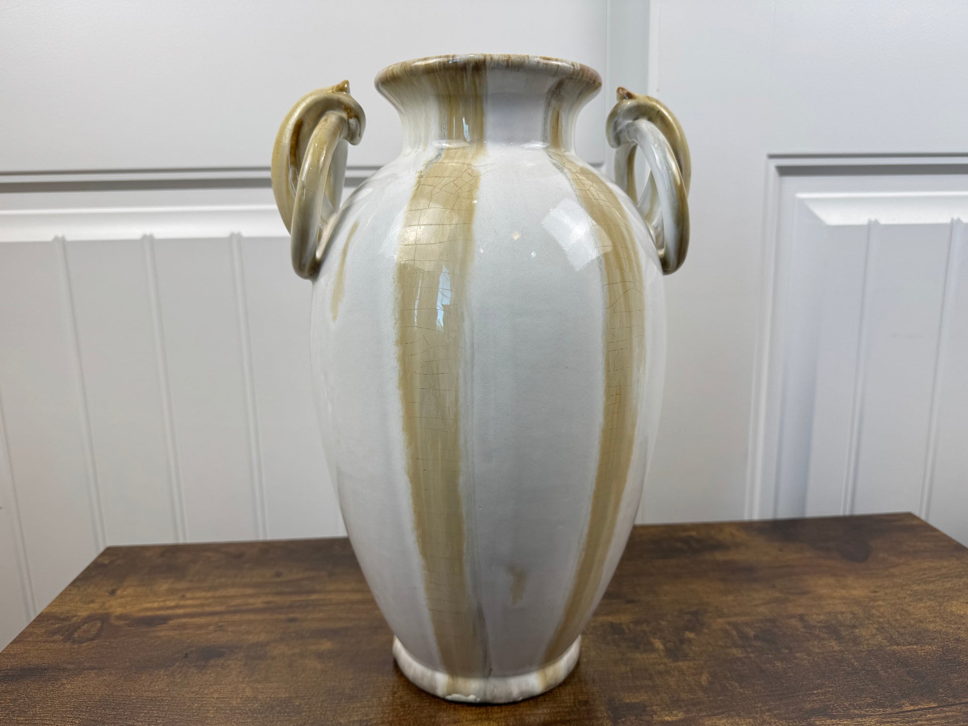 Bring timeless beauty into your home with this Greek and Roman–inspired amphora-style vase. Featuring a graceful two-handled design, this large ceramic vase blends classic form with modern neutral tones of creamy white and soft sand.