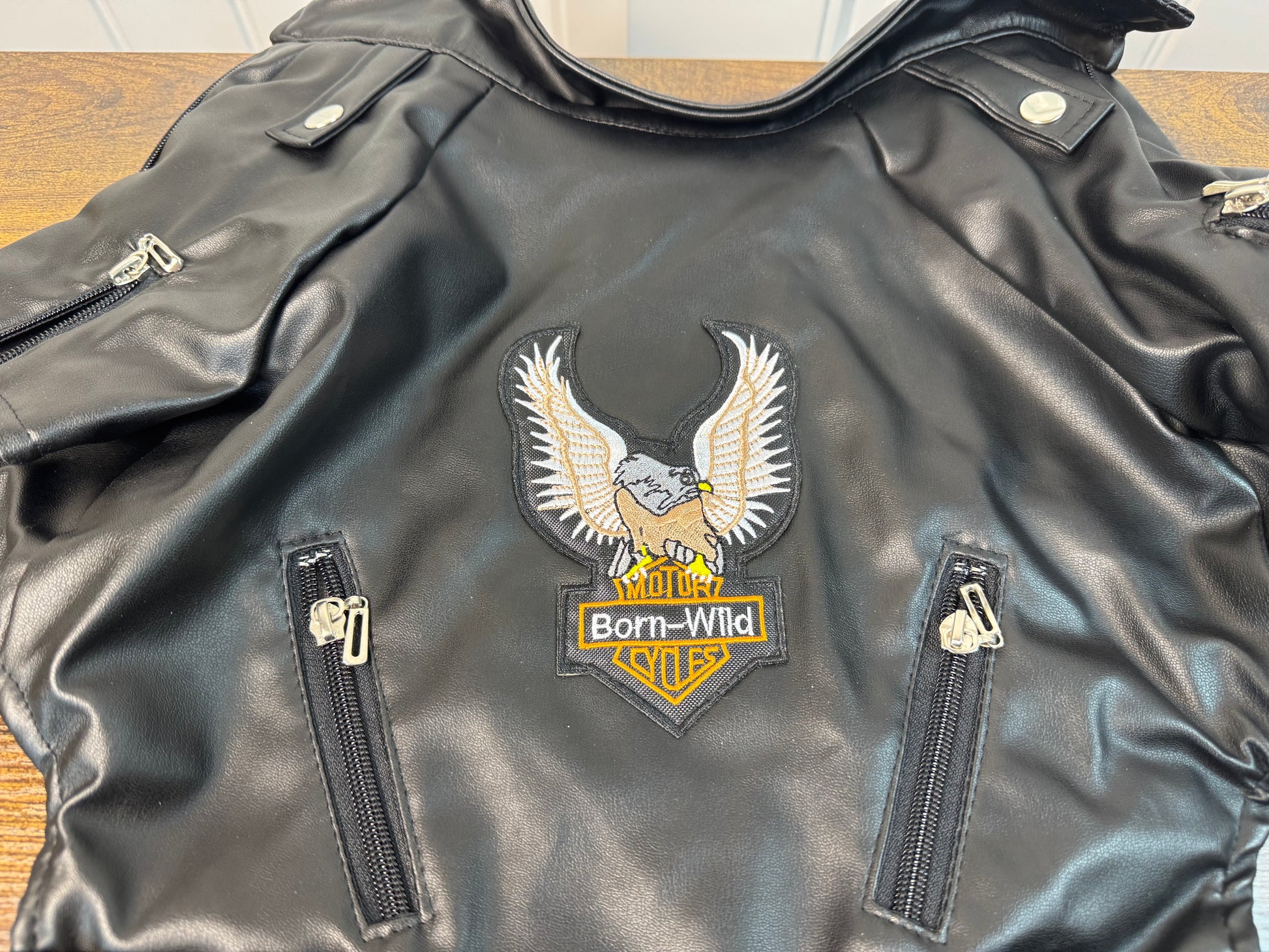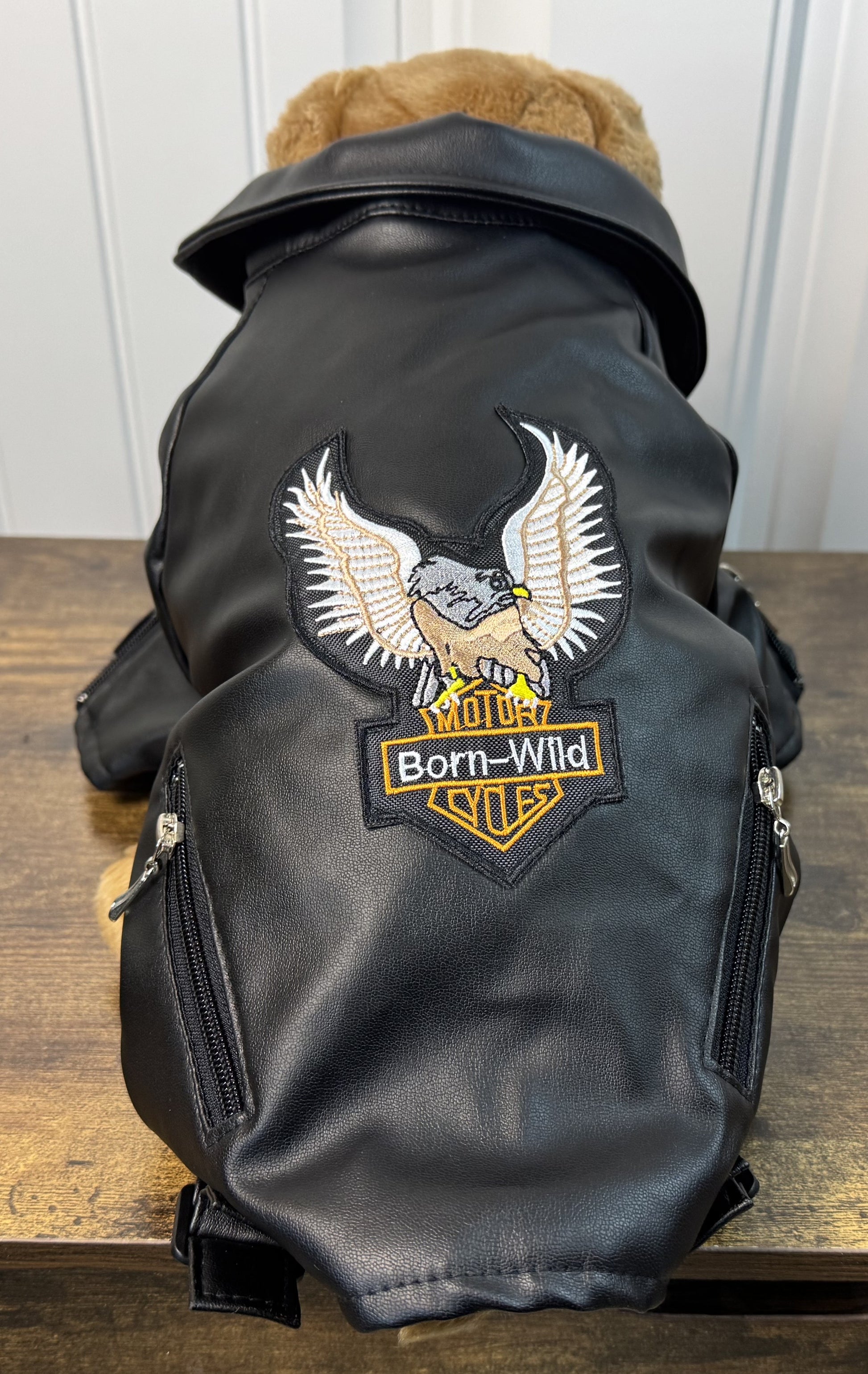 Dog Faux Leather Biker Jacket – “Born Wild” Eagle Design