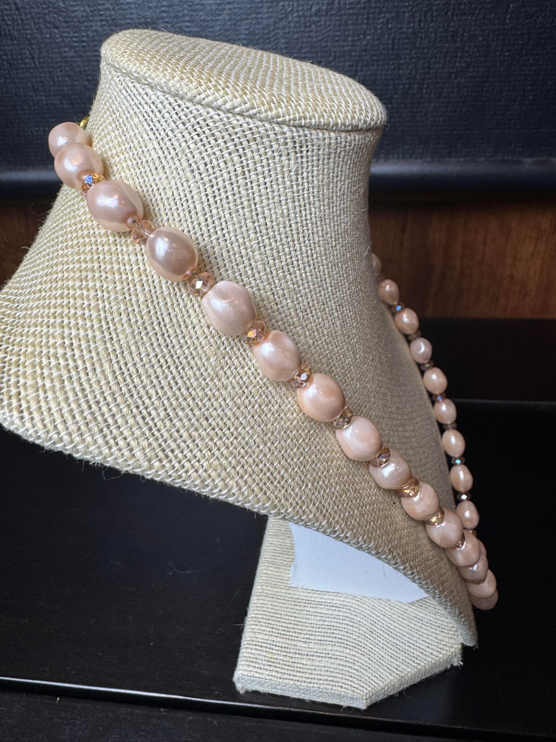 Dripping with elegance, this 29-inch vintage necklace showcases lustrous pink faux pearls in unique nugget/baroque shapes, paired with delicate clear pink glass beads for added sparkle. Finished with a gold-tone hook clasp, it radiates a glamorous luster fit for royalty.