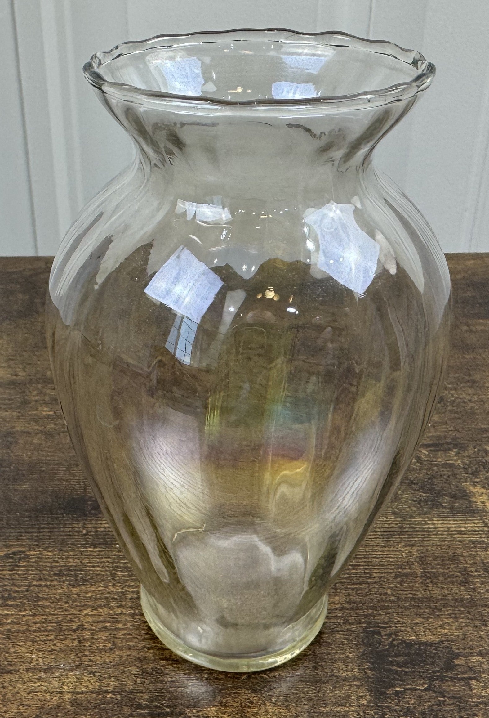Add a touch of timeless elegance to your décor with this stunning handblown iridescent glass vase. Standing 5.75" tall and 3.5" wide, it features a beautifully scalloped, wavy rim that gives it a soft, flowing silhouette. The vase showcases an optic swirl pattern that catches and bends the light, creating a shimmering rainbow effect from every angle.