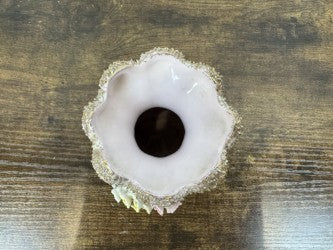 Add a touch of romantic vintage charm to your space with this sweet pink Crown Fine China vase, featuring ornate 3D floral appliqués, hand-painted pastel blooms, and a scalloped gilt and glittered rim. Measuring approximately 5 inches tall, this small but eye-catching vase is the perfect accent for a cottagecore shelf, vanity tray, or tea party table.