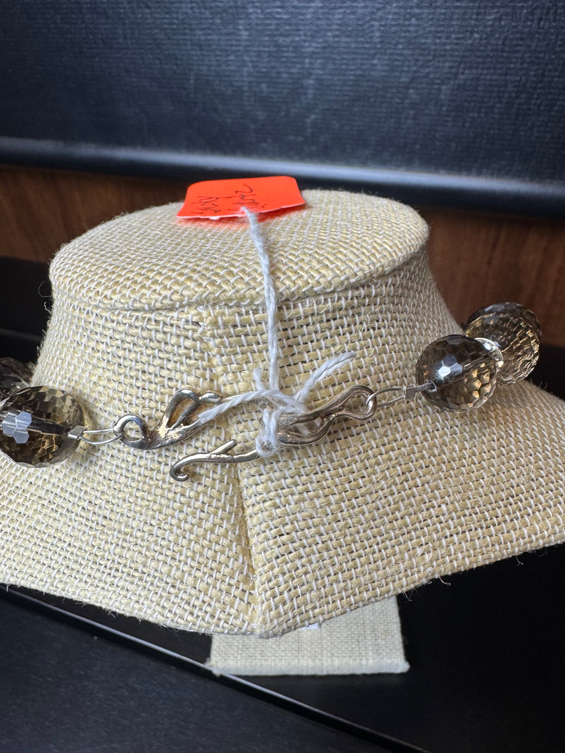 Exuding timeless elegance, this vintage necklace features large smoky quartz beads accented with sparkling rhinestone and silver-toned spacers. The warm brown-grey tones catch the light with a subtle dazzle, creating a look that feels both glamorous and refined—truly a piece that could grace the neck of a star.