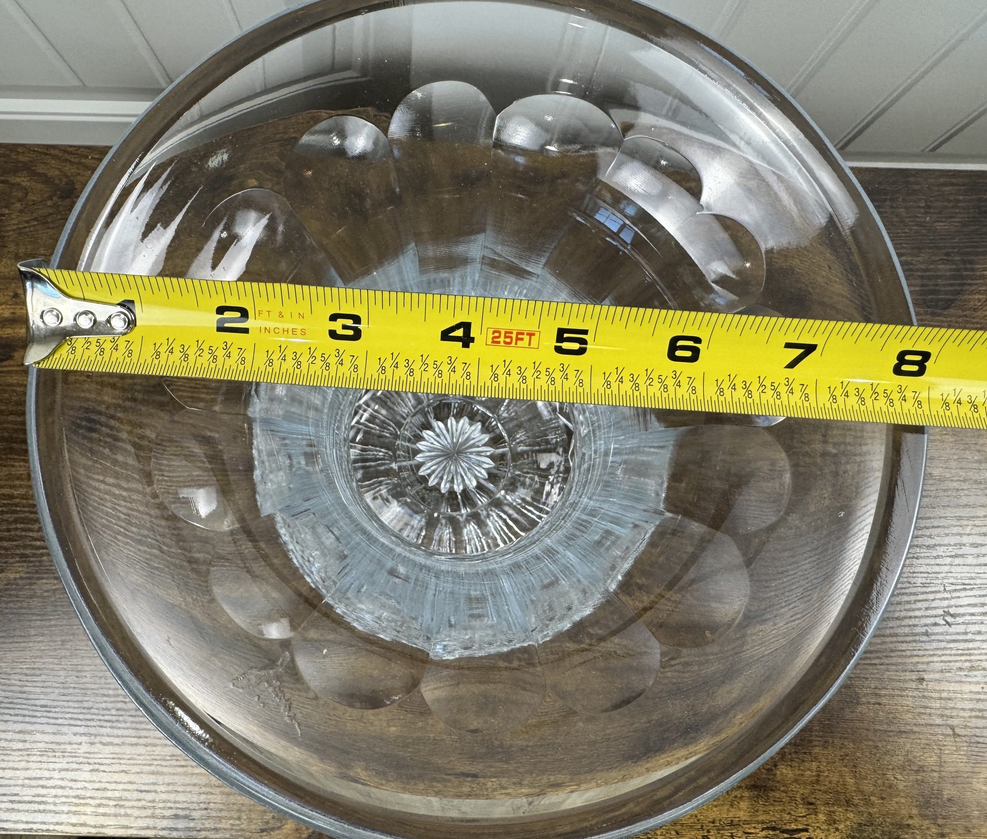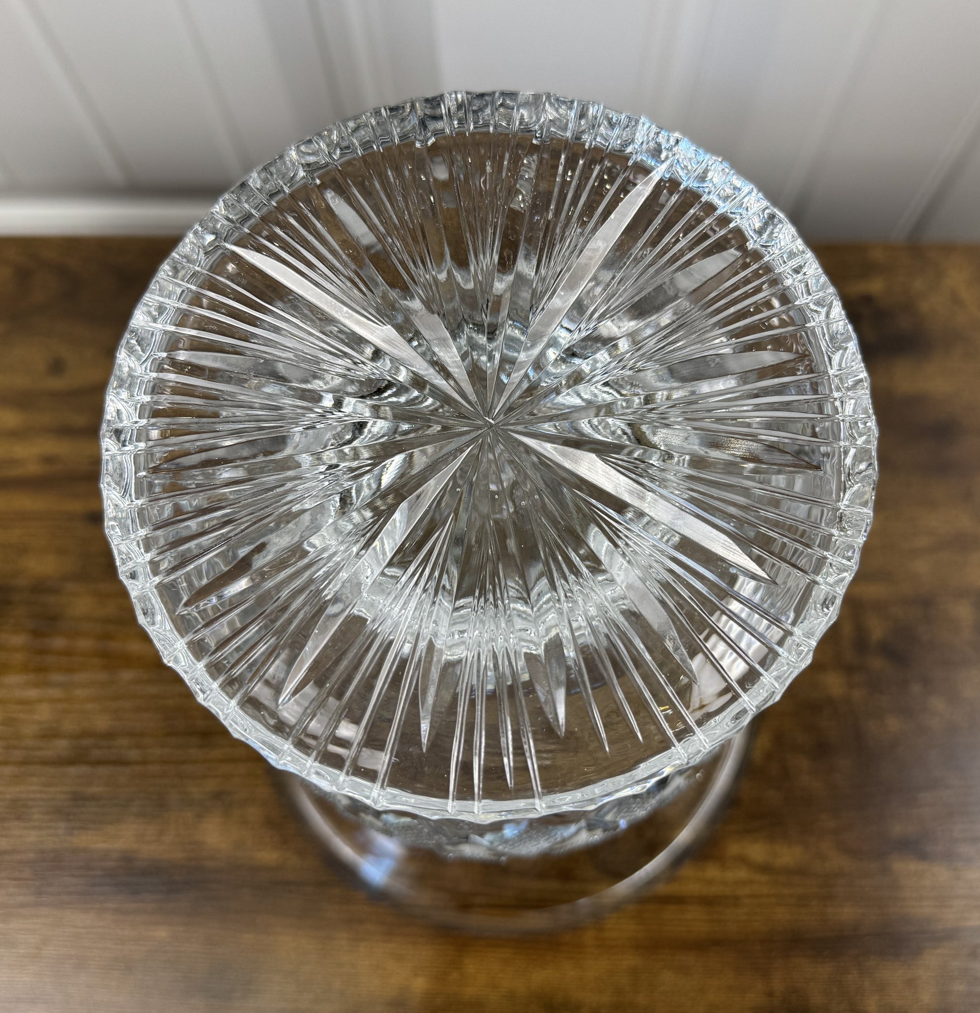Add instant elegance to your space with this stunning Waterford cut crystal footed trumpet vase. Featuring vertical optic flute cuts, a diamond criss-cross band, and a sparkling starburst base, this piece catches and reflects light beautifully from every angle. With its impressive 11.5" height and substantial 8.2 lb weight, it makes a dramatic statement as a centerpiece or on display.